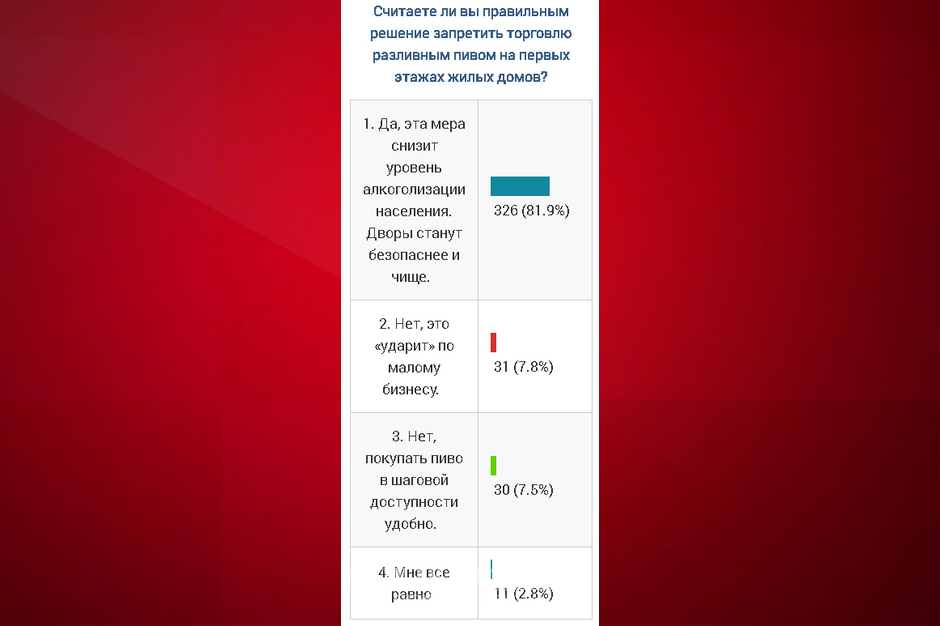Напомним, по данным мэрии, в Братске около 200 торговых точек, которые реализуют разливное пиво. Многие из них находятся в жилых домах. Вопрос о запрете в них торговли вынесли на общественное обсуждение. На сайте мэрии идёт голосование. По данным на 3 июля, более 80 процентов проголосовавших высказываются за запрет торговли разливным пивом в жилых домах. По их мнению, это снизит уровень алкоголизации населения и сделает дворы чище и безопаснее.