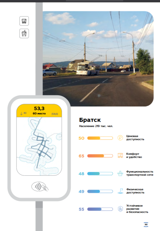 Средний балл Братска с учетом всех показателей составил 53,3, что соответствует 60-му месту. Отдельно составители рейтинга отметили, что для Братска характерен рост непрямолинейности маршрутов и увеличивающиеся интервалы движения транспорта.