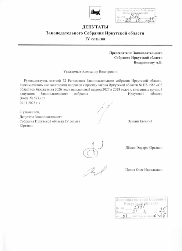 Руководствуясь статьей 72 Регламента Законодательного собрания Иркутской области, просим считать нас соавторами поправок к проекту закона Иркутской области № ПЗ-1586 «Об областном бюджете на 2026 год и на плановый период 2027 и 2028 годов, — говорится в письме парламентариев.