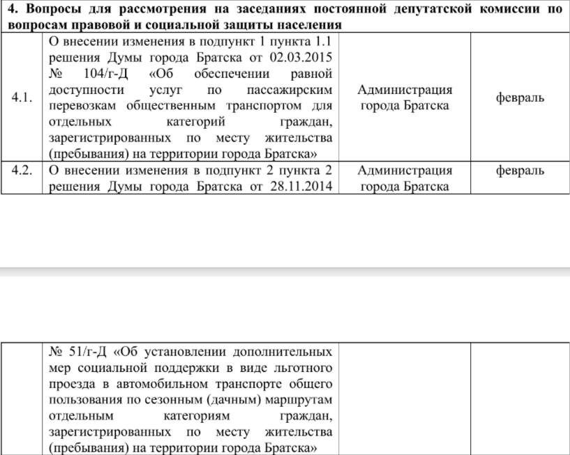 Как указано в документе, в феврале следующего года постоянная депутатская комиссия по социальной защите должна рассмотреть изменения в пункт действующего решения Думы Братска о льготном проезде на дачных автобусах, касающийся размера частичной оплаты проезда для детей и пенсионеров, а также изменения в пункт, касающийся стоимости ежемесячного проездного билета для льготников, в другом действующем решении Думы Братска. Инициатором вносимых изменений в обоих случаях указывается администрация Братска. Какие именно изменения планируется внести, в плане работы думы не указано.