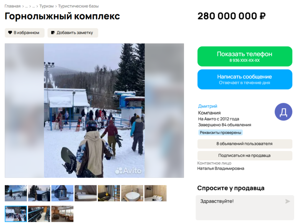 В объявлении указывается, что горнолыжный комплекс продается вместе со всем оборудованием: подъемниками, техникой для укатки горнолыжных трасс, снегоходами. Кроме этого, в состав комплекса входят модульные гостевые дома, два кафе и так далее.