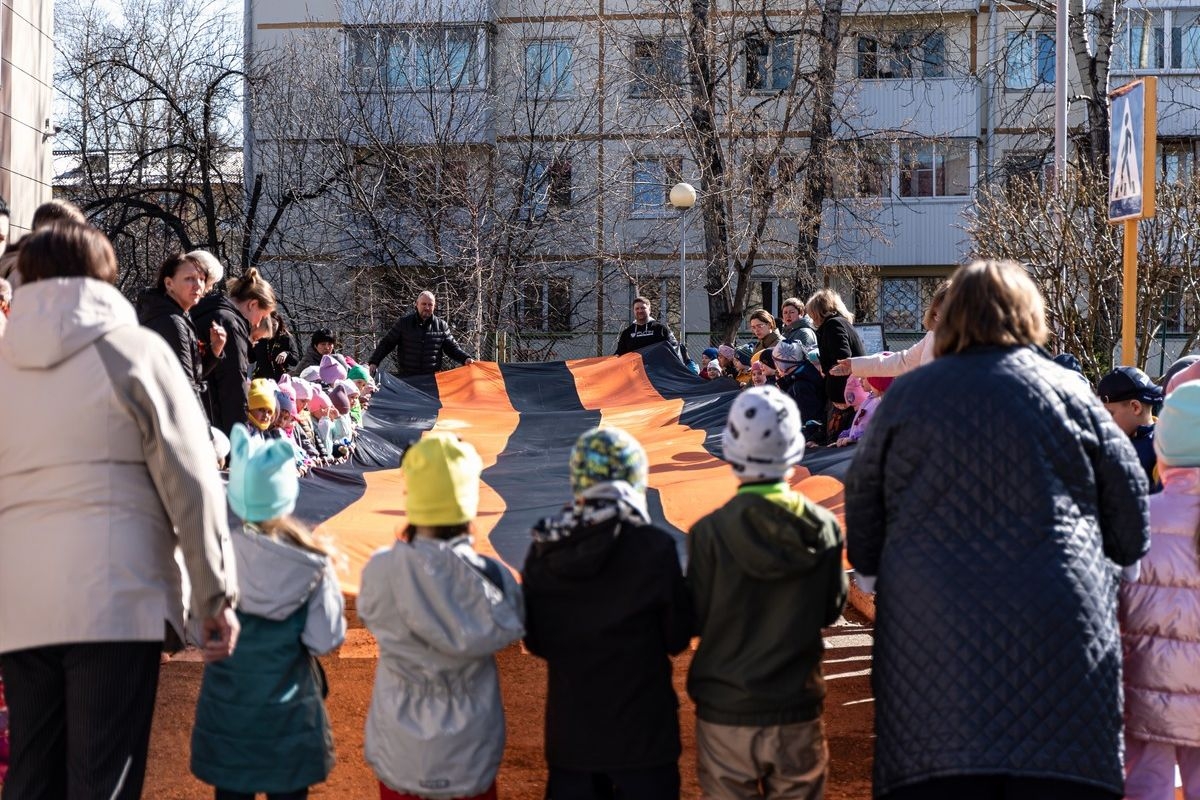 На территории дошкольного учреждения участники акции развернули 20-метровую Георгиевскую ленту под звуки гимна России. Перед воспитанниками выступил глава Шелехова, секретарь местного отделения «Единой России» Алексей Тенигин.