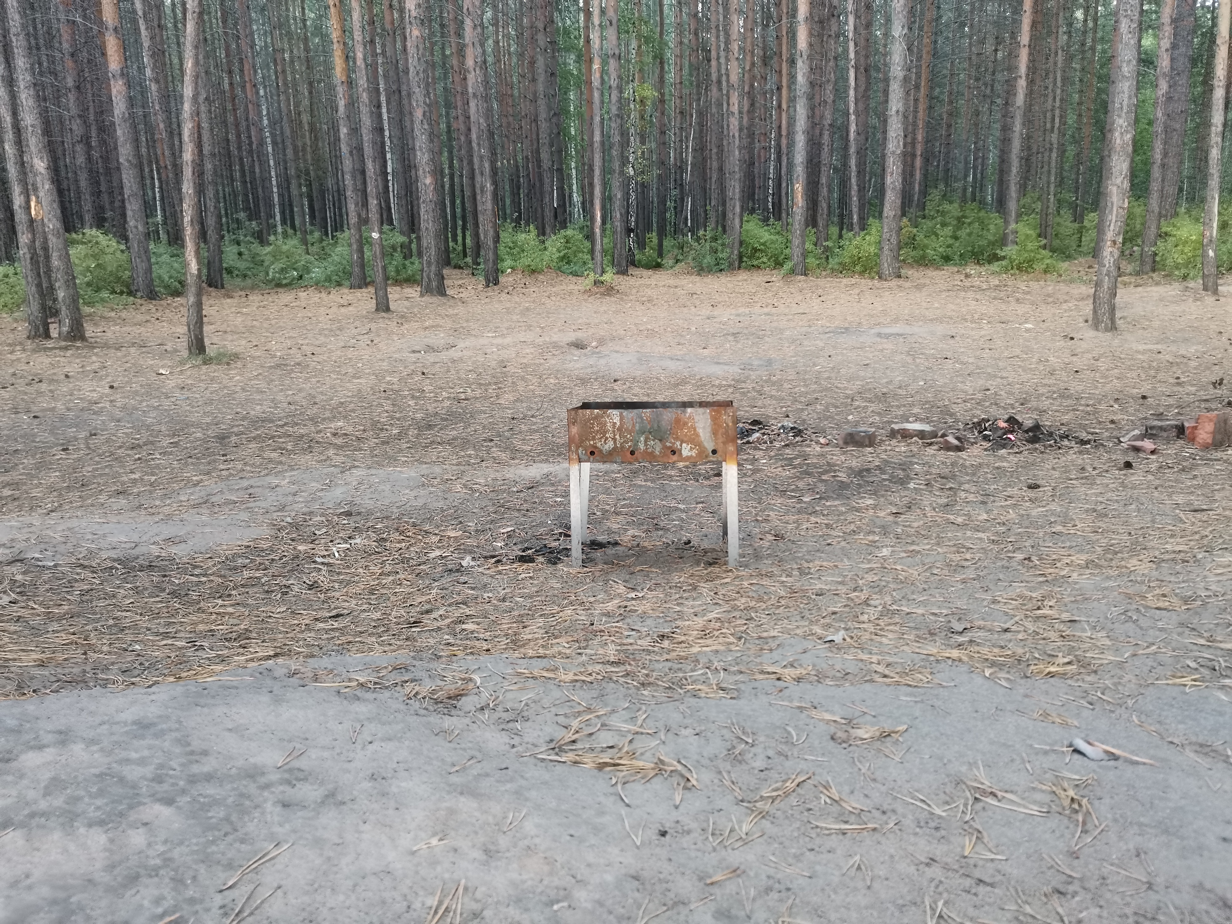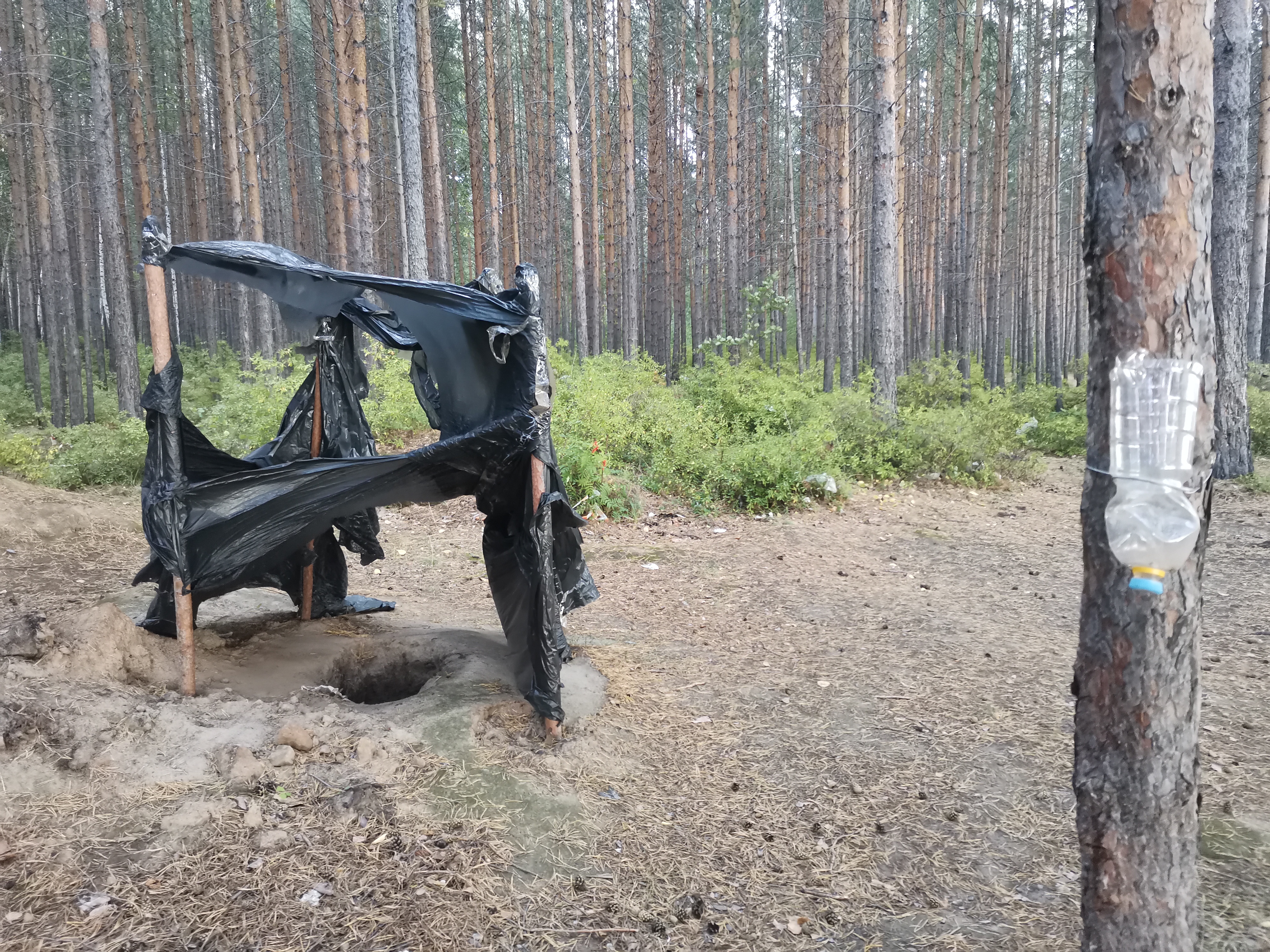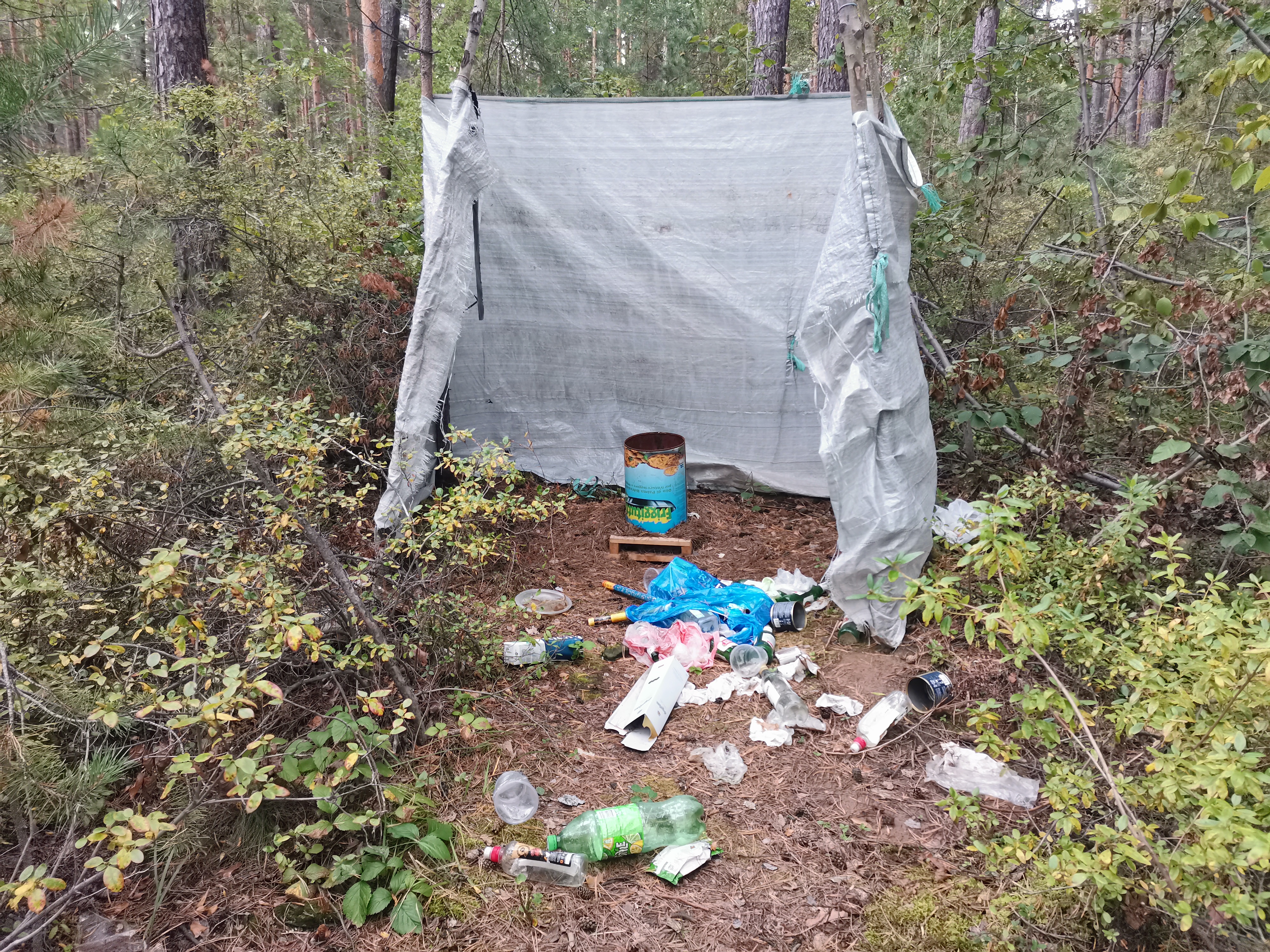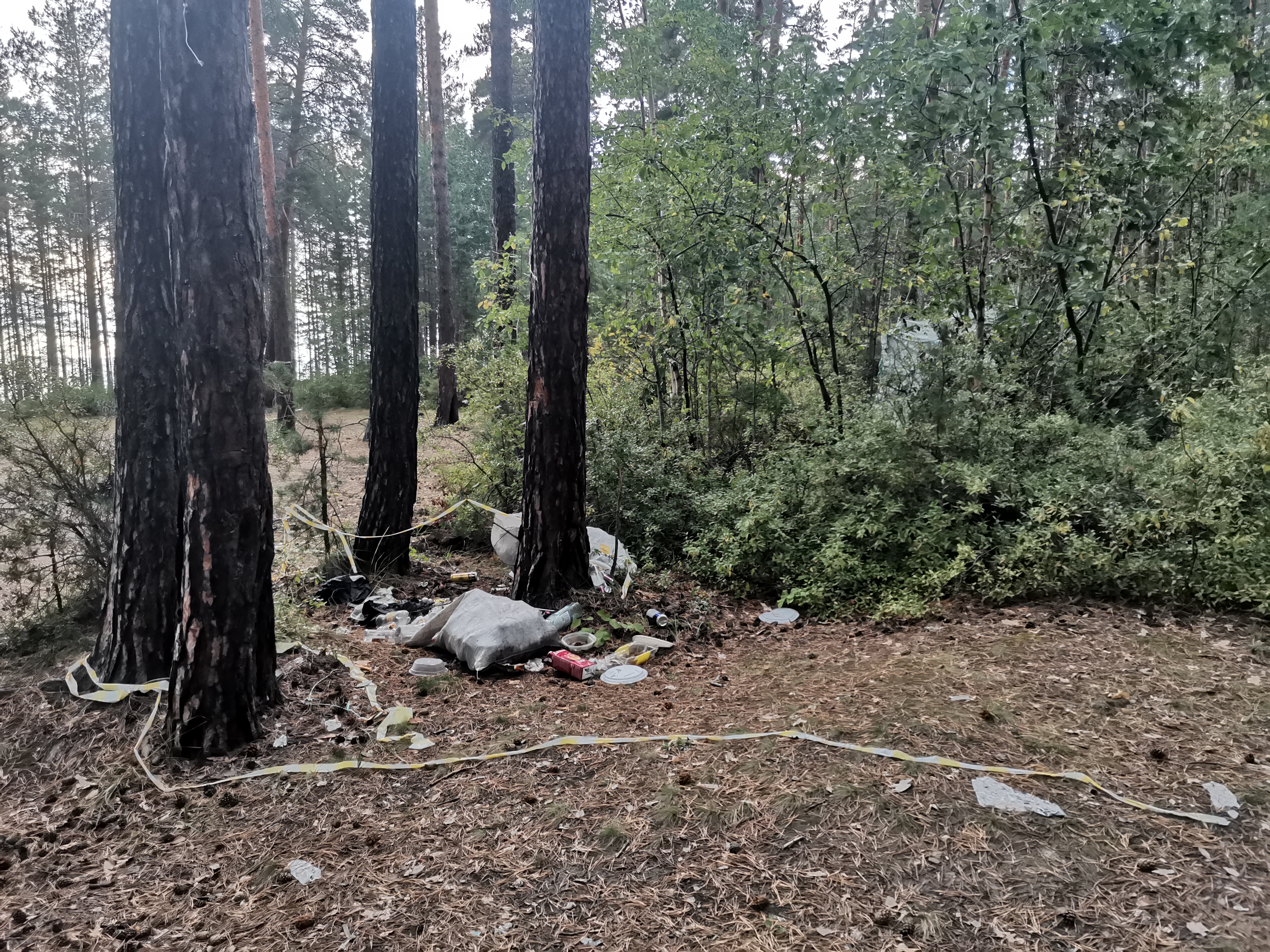 Также на деревьях остались остатки сигнальных лент, которыми отдыхающие огораживали территорию. Периодически в лесополосе попадаются импровизированные туалеты — натянутые вокруг специально вырытых ям полотнища ткани или прочной пленки. В этих же ямах находятся отходы от продуктов. Также в пляжной зоне довольно много брошенных небольших дешевых мангалов.