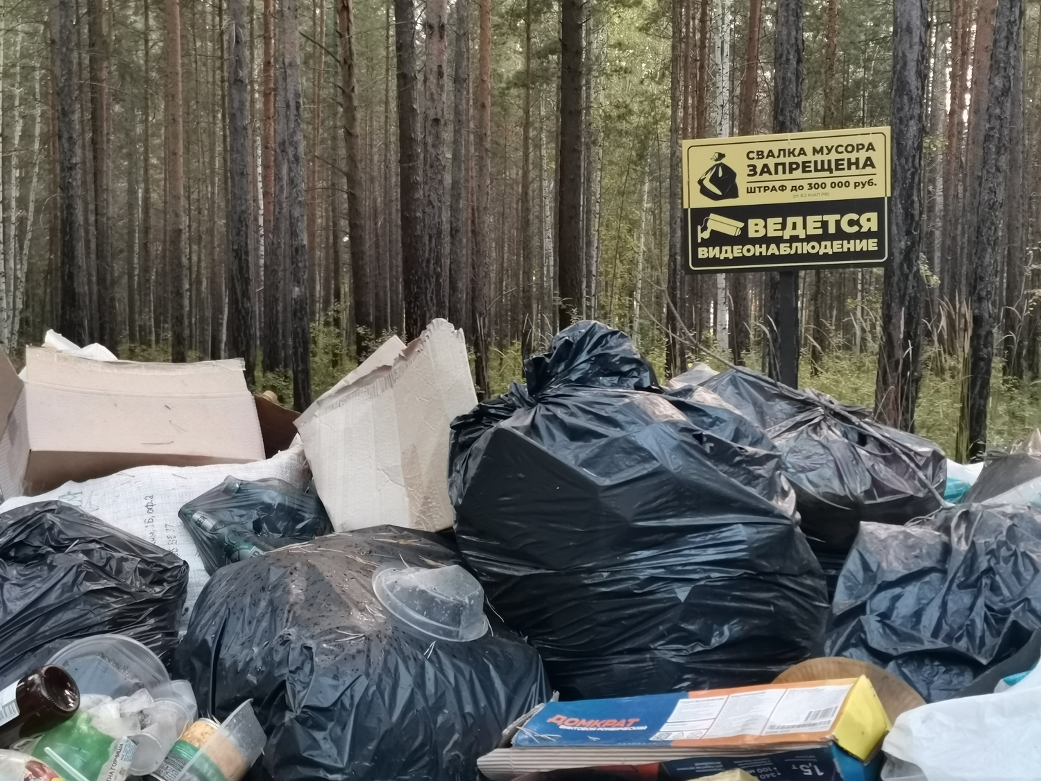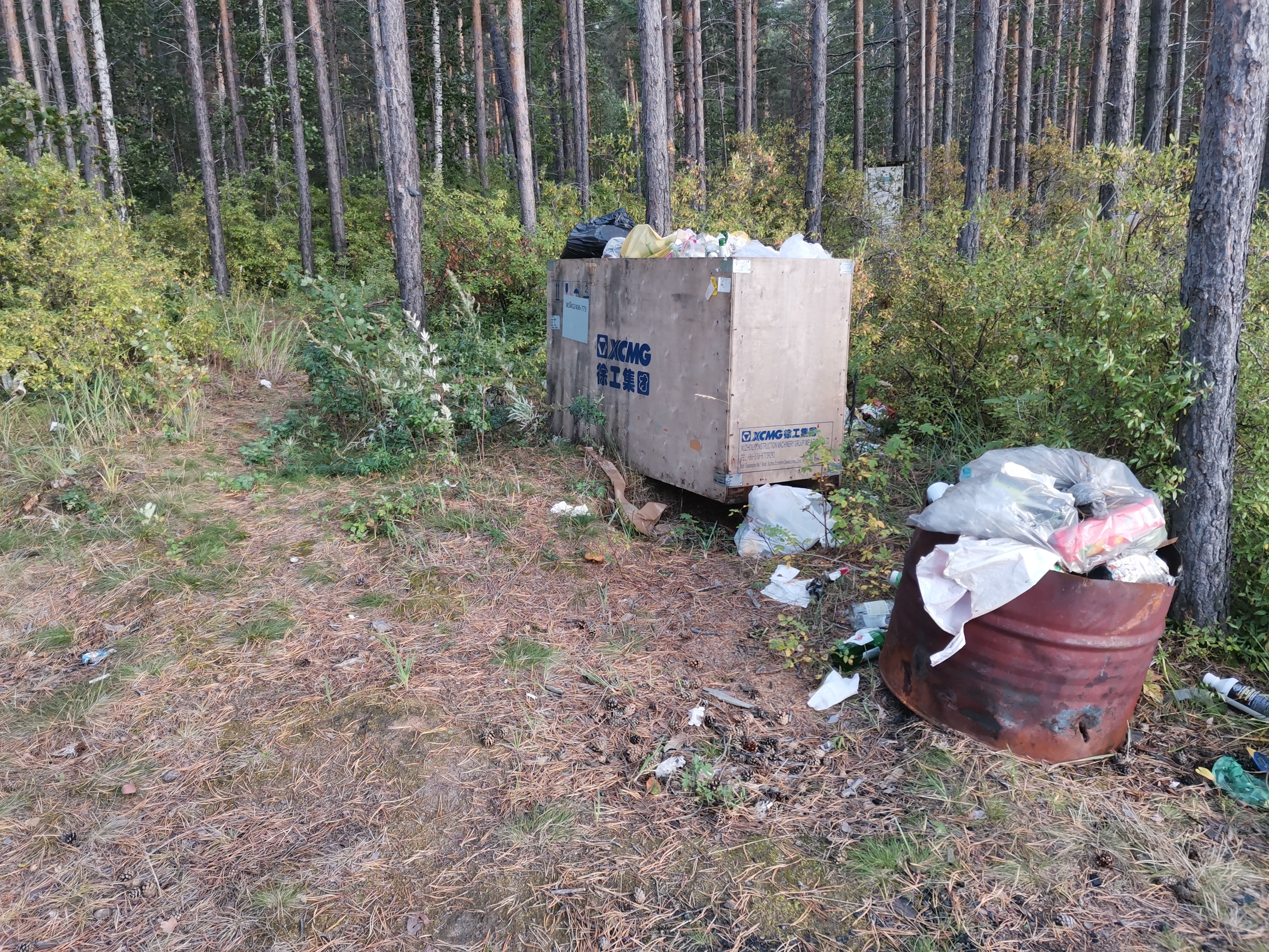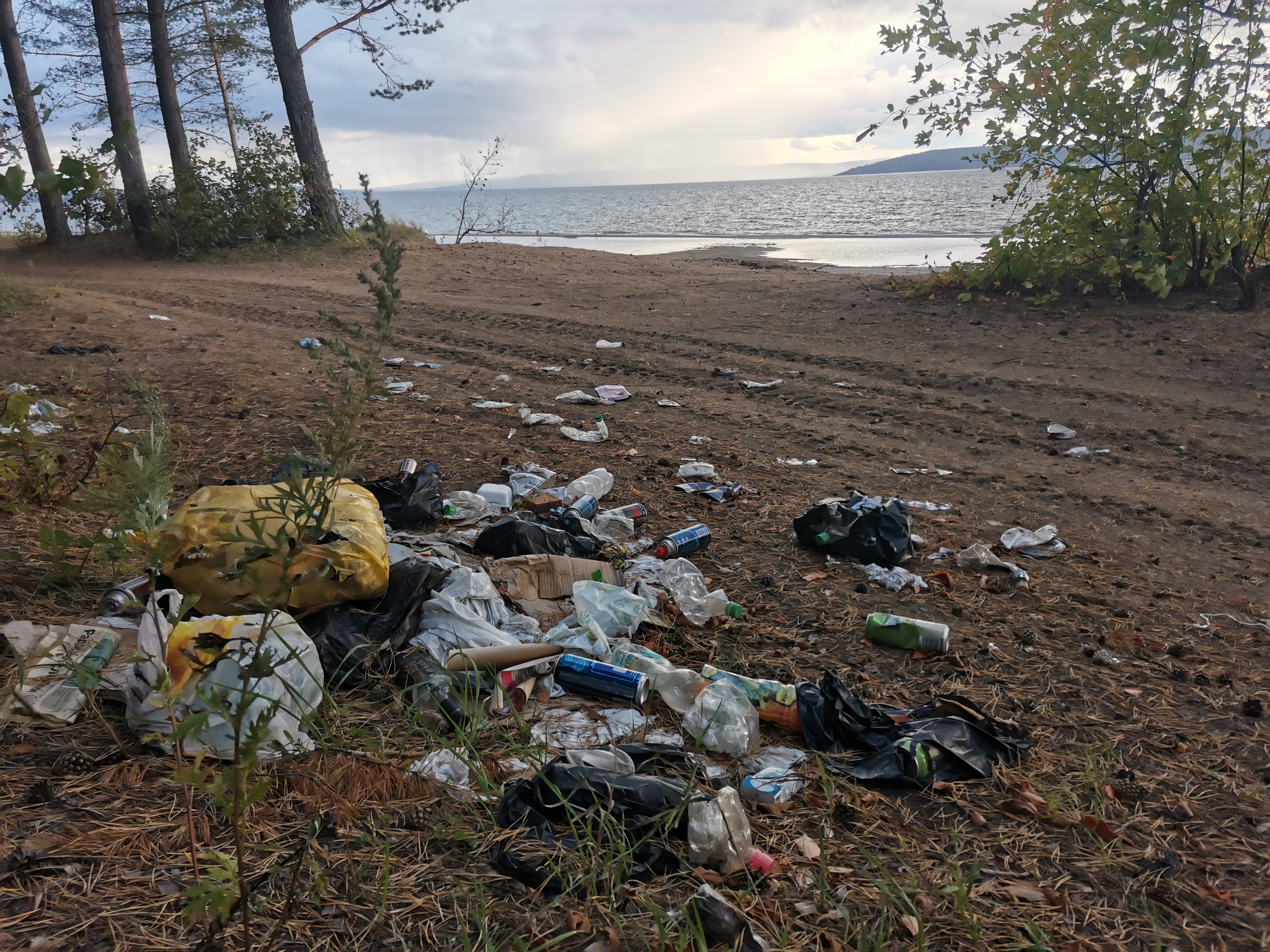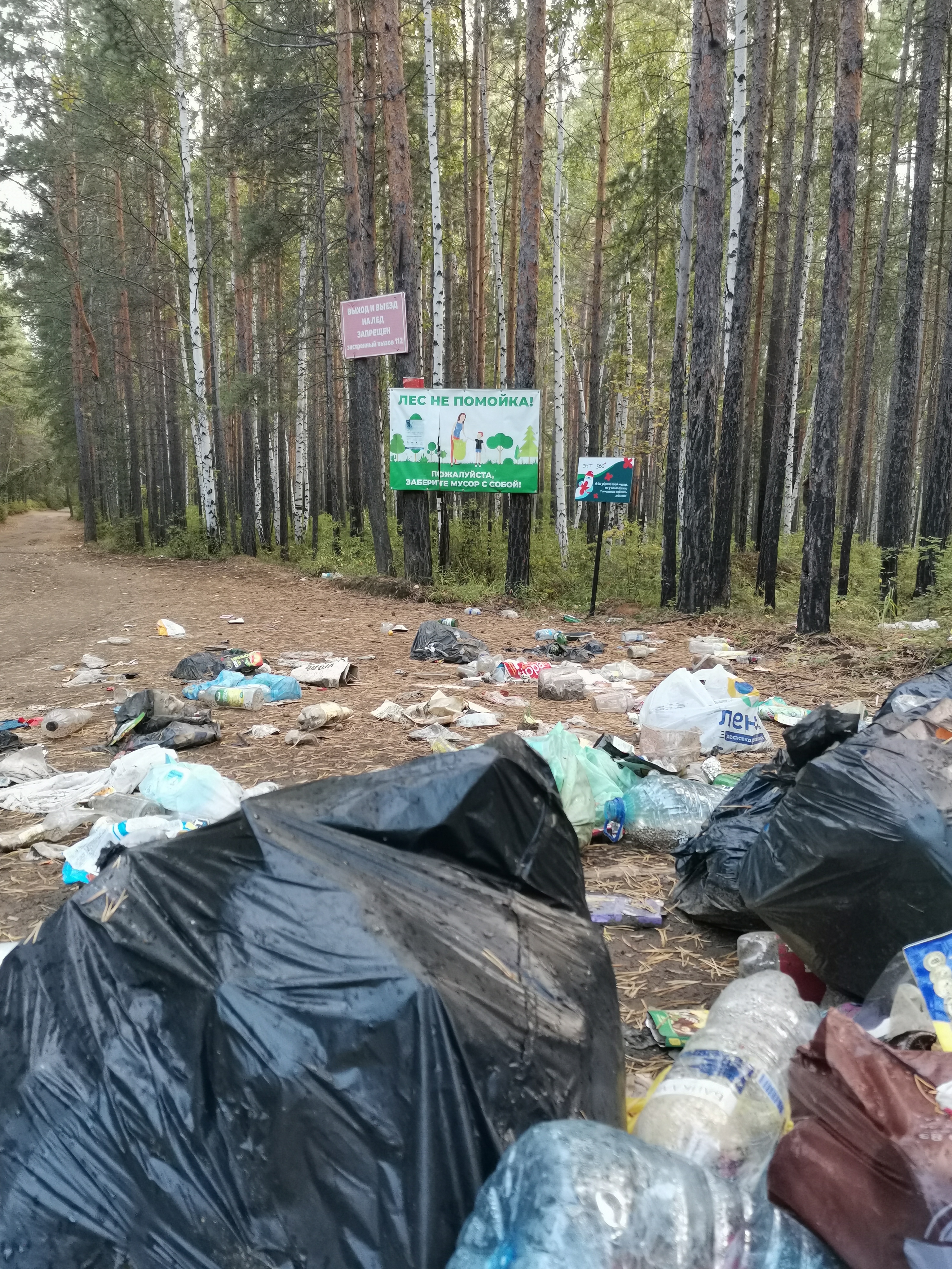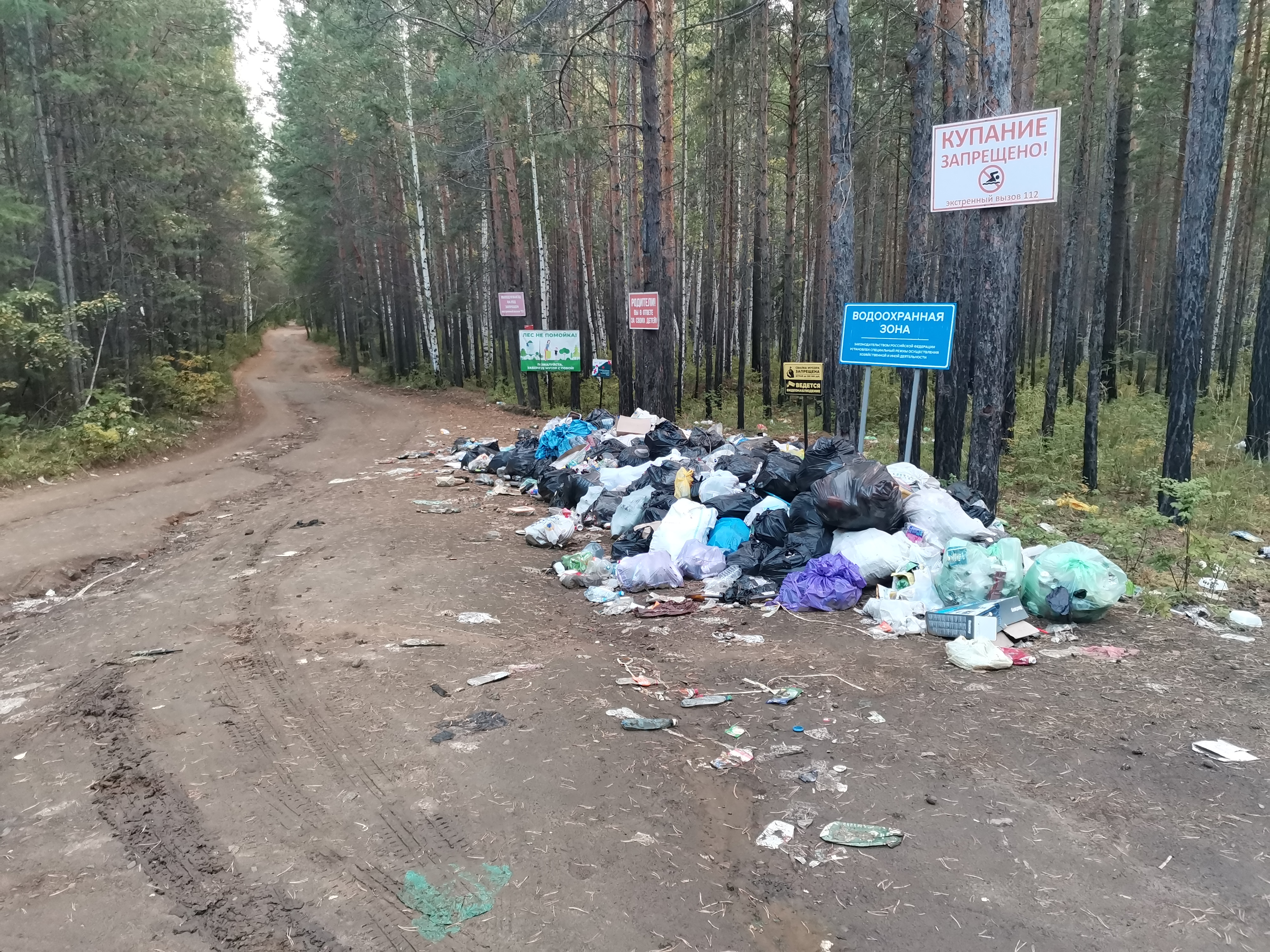 В отдельных местах мусор сложен в кучи, тем не менее пакеты, в которых он находится, постепенно рвутся и отходы разлетается по территории. Особенно много пакетов находится на въезде к «пляжу» — там мусор складировали прямо под табличками, которые запрещают это делать. По всей видимости, многие отдыхающие всё же собирали за собой мусор, однако не увозили его с собой, а бросали у выезда на автодорогу.
