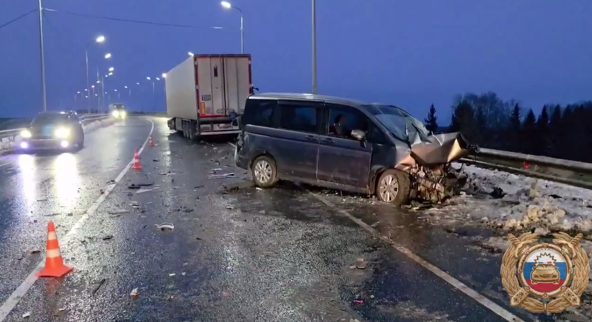 По предварительной информации, водитель автомобиля Honda Stepwgn не справился с управлением, выехал на полосу встречного движения и столкнулся с фурой.
