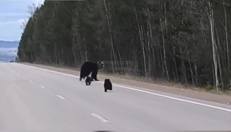 На кадрах, снятых очевидцами, животные сначала двигались вдоль трассы, а затем скрылись в лесу. Мама – медведица явно испугалась проезжающих машин и поспешила увести потомство в тайгу.