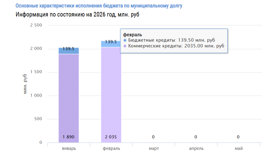 За месяц муниципальный долг Братска вырос почти на 150 миллионов рублей и сейчас составляет около 2,175 миллиардов рублей. В структуре муниципального долга основную долю занимают кредиты, которые были набраны в коммерческих банках. На них приходится 2,035 миллиардов рублей, или 93,6%. Остальная часть — 139,5 миллионов рублей — бюджетные кредиты с низкой процентной ставкой.