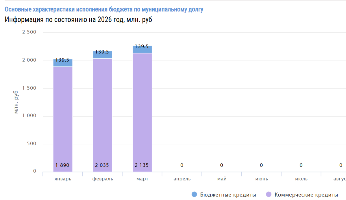 В структуре муниципального долга по-прежнему основную долю занимают кредиты, которые были набраны в коммерческих банках. На них приходится 2,135 миллиарда рублей (почти 94%). На бюджетные кредиты с низкой процентной ставкой приходится 139,5 миллионов рублей (чуть более 6%).