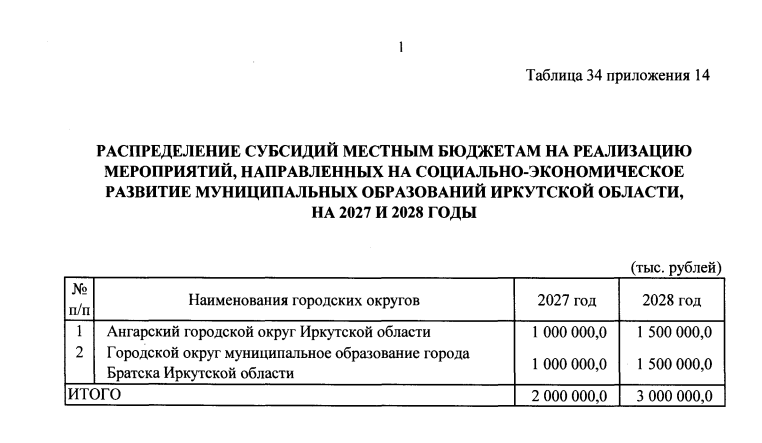 Тем не менее средства по индивидуальной программе развития для Братска и Ангарска предусмотрены на 2027 и 2028 годы: по 1 миллиарду и по 1,5 миллиарда рублей соответственно для каждого города.