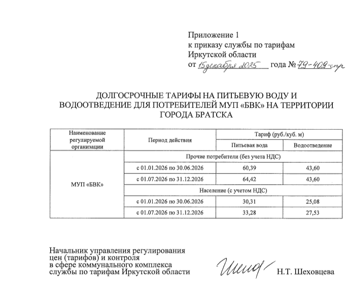 На 9,8% вырастет тариф на холодную воду и водоотведение в Братске в 2026 году. Служба по тарифам Иркутской области утвердила тарифы для муниципального предприятия «Братский водоканал» (МУП «БВК»). Соответствующий приказ ведомства размещен на сайте правовой информации Иркутской области, передает информационное агентство «ТК Город».