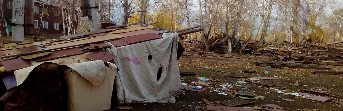 На фото видно, что строение находится возле столба электросетей, который служит опорой для шалаша. Стены сделали из старых кресел и диванов. Вместо дверей – старые ковры. Кровля сколочена из досок, фанеры и дверей от шкафов. Судя по всему, за материалами «умельцам» далеко ходить не пришлось. Рядом идёт разбор сразу нескольких ветхих двухэтажек, площадки не огорожены и никак не охраняются.