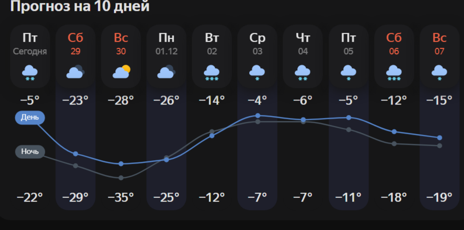 Также холодно будет и в понедельник, 1 декабря, затем постепенно начнет теплеть. К следующим выходным синоптики обещают уже не такие сильные холода — в районе -15 градусов.