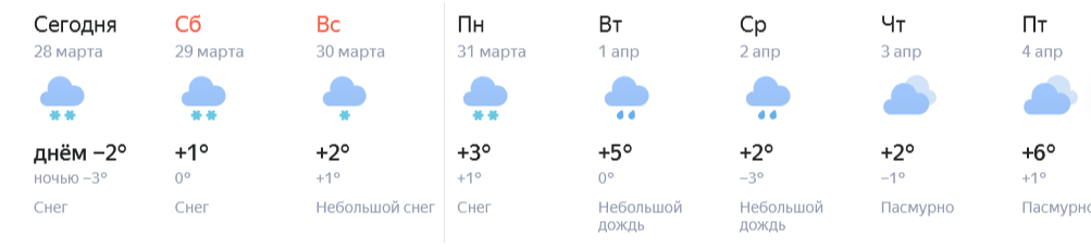 Судя по данным Яндекс.Погоды, уже в эту субботу в городе начнет снова таять снег — 29 и 30 марта воздух днем в Братске будет прогреваться до плюс 2 — плюс 3 градусов по Цельсию. Примерно такая же температура будет держаться всю будущую рабочую неделю. В отдельные дни столбики термометров днем будут подниматься до +6 градусов днем. По ночам же температура будет колебаться от минус 1 до плюс 3 в разные дни. Также в Братске в ближайшую неделю прогнозируются осадки в виде снега и дождя.