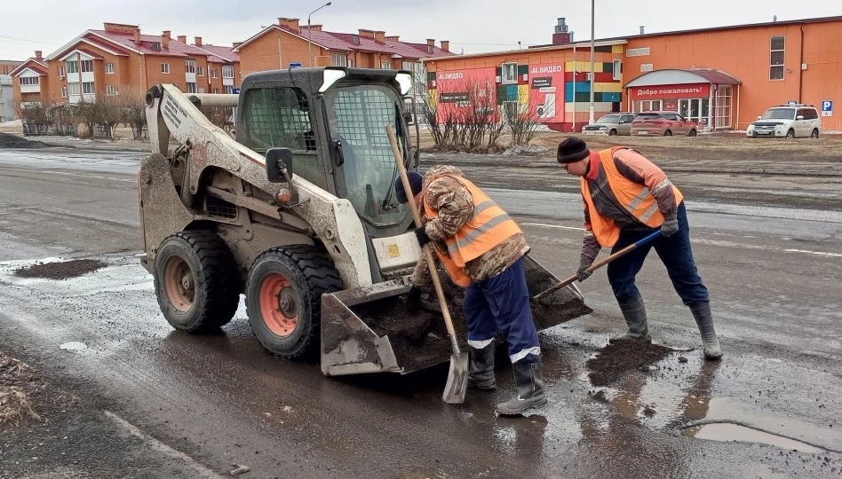 Работы по засыпке выбоин асфальтом идут на участке, где после схода снега образовались крупные повреждения. Временная мера предназначена, чтобы снизить риск ДТП, а также для более безопасного движения транспорта.