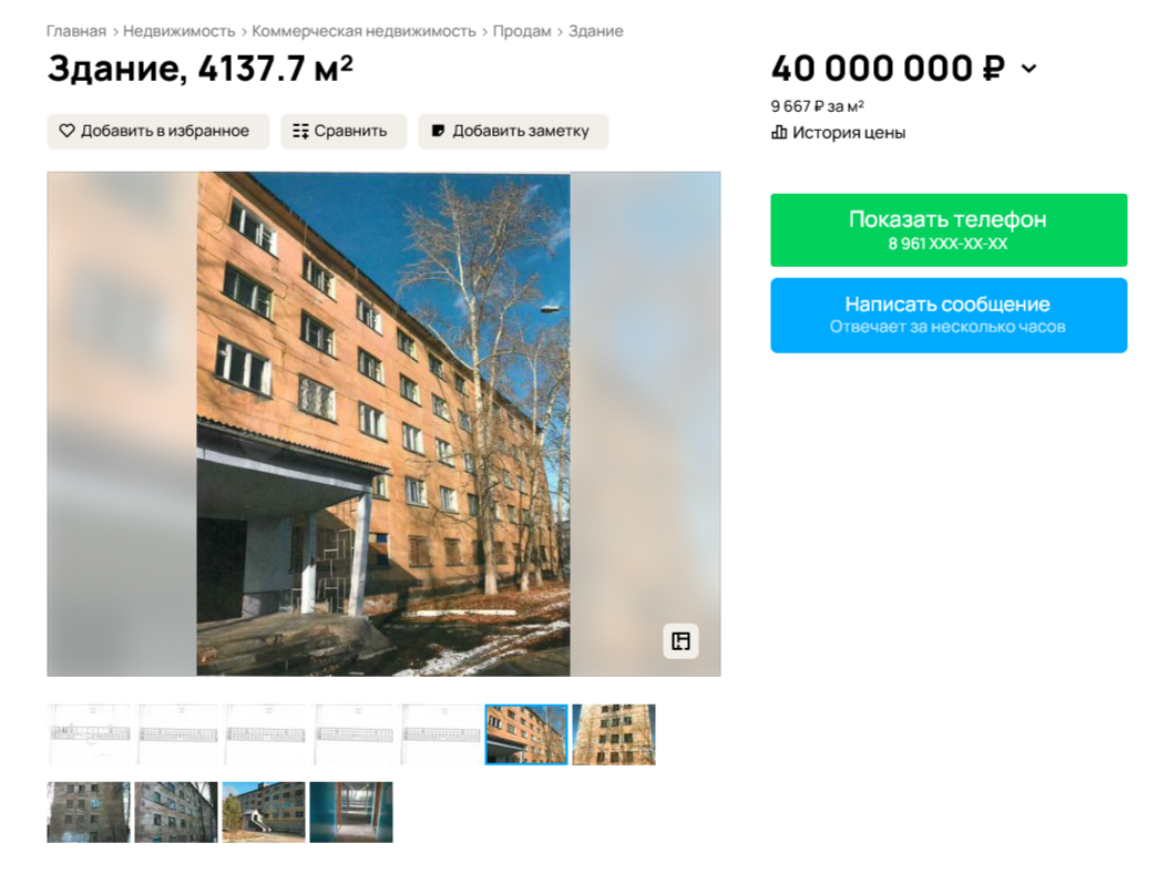 В Братске снова продают недействующее общежитие в Центральном районе. Собственник объекта планирует выручить за него 40 миллионов рублей. Соответствующее объявление размещено на сайте «Авито», передает информационное агентство «ТК Город».