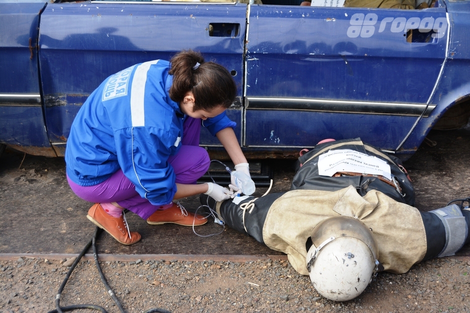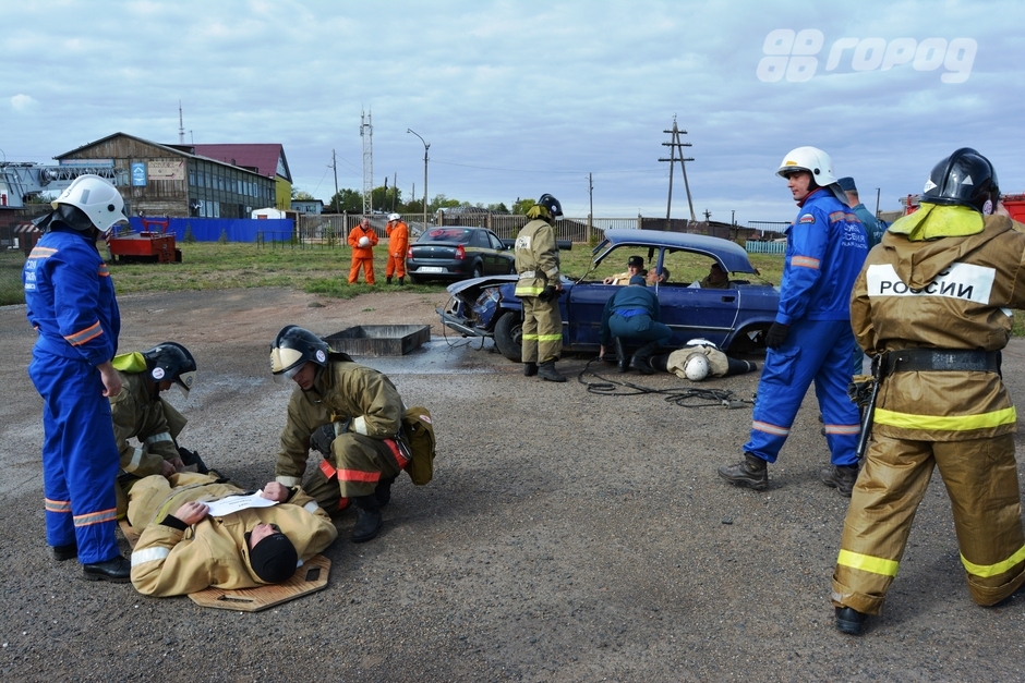 Все происходило на базе пожарно-спасательной части №26 Братска. Первыми на место «происшествия» прибыли пожарные и спасатели. Сотрудники МЧС принялись предотвращать воспламенение вытекшего бензина и оказывать помощь выброшенному из машины человеку. «Пострадавшего» с черепно-мозговой травмой и переломом позвоночника уложили на твердые носилки и зафиксировали его.