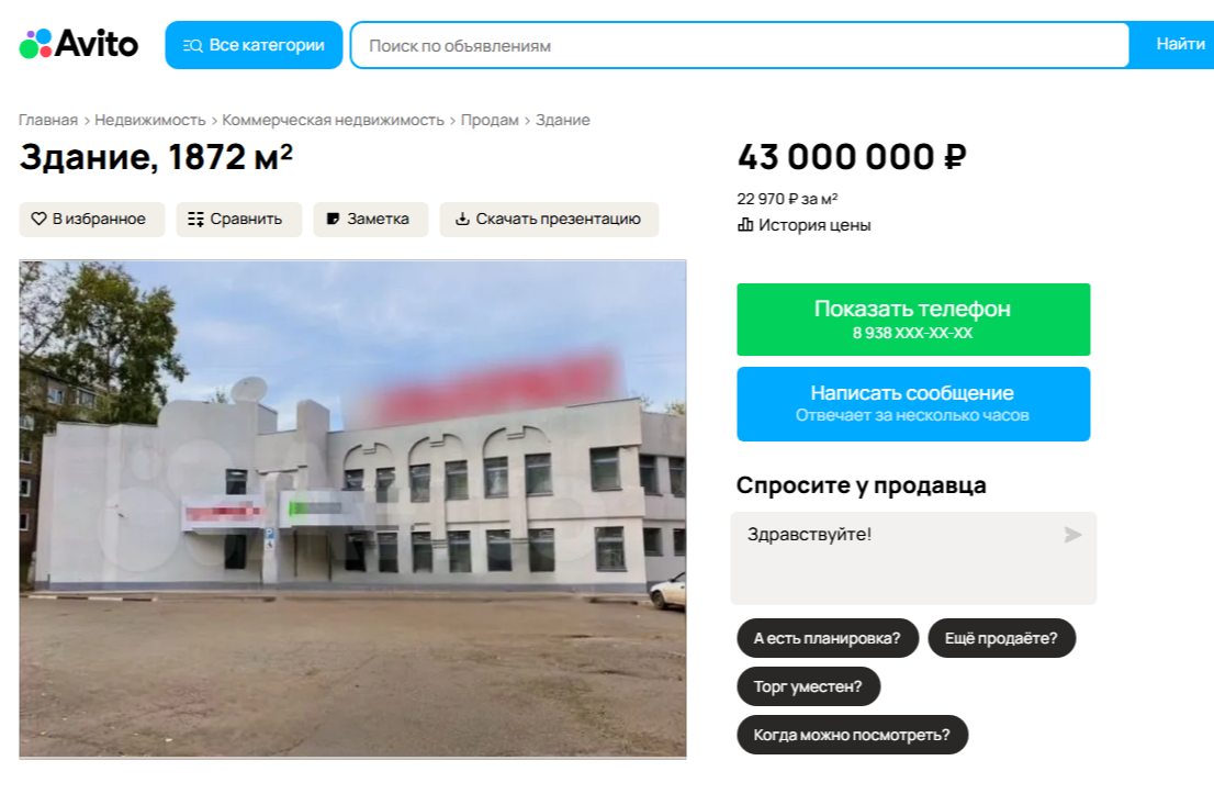 В объявлении уточняется, что здание находится «на первой линии центральной части города». Есть подвальное помещение и грузовой лифт.