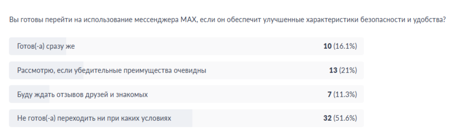 На момент публикации этого материала в опросе приняли участие чуть более 60 человек. При этом пользовались мессенджером только 13 человек, а больше половины не готовы на него переходить ни при каких условиях.