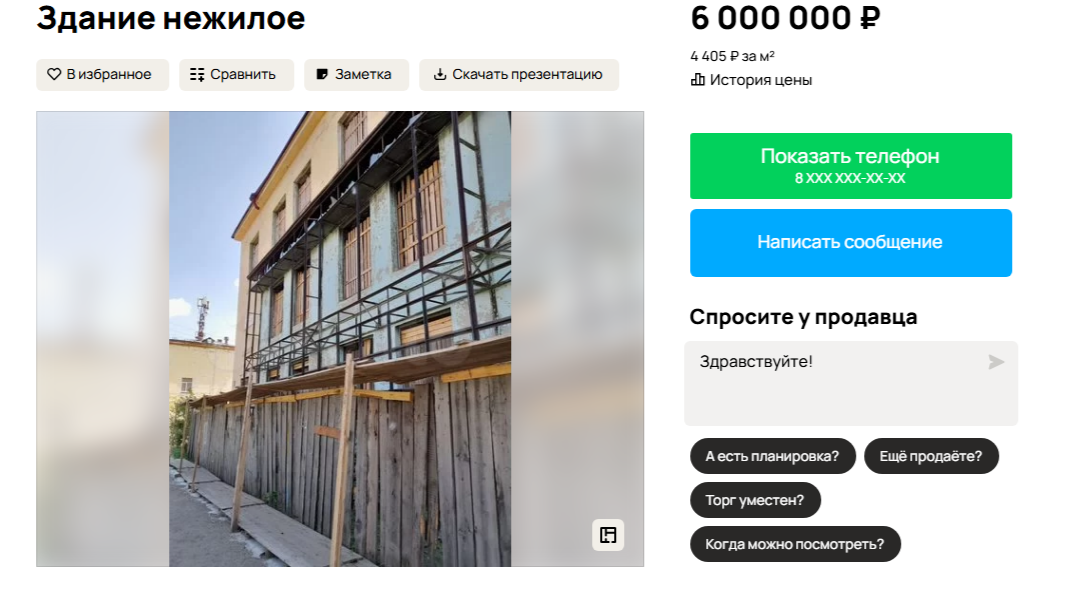 Судя по фотографиям, объект находится на консервации — у него заколочены окна на всех этажах. За здание собственник намерен выручить 6 миллионов рублей.