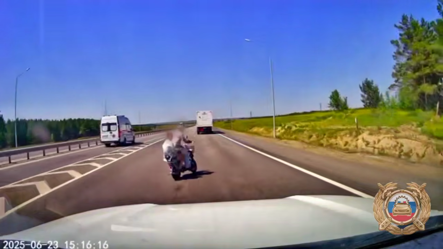 Инцидент произошел на федеральной трассе «Сибирь» днем 23 июня. На кадрах видеорегистратора китайского внедорожника «TANK» видно, как автомобиль сбивает электровелосипед, который двигается в попутном направлении. В результате 53-летний водитель электровелосипеда и 15-летняя пассажирка получили травмы и были госпитализированы.
