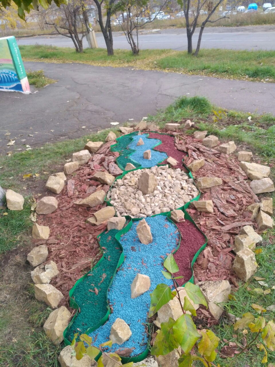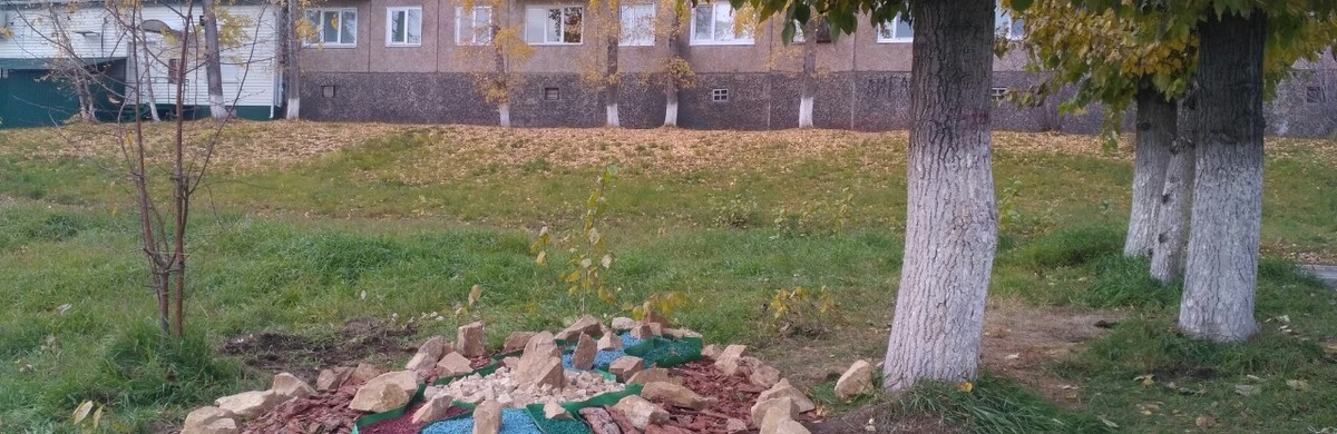 Размер композиции невелик – около 3-х квадратных метров. Размахнуться шире помешал дефицит материала – в распоряжении волонтеров было по 15 литров зелёной, синей и красной каменной крошки, также 30-40 крупных кусков песчаника. Все это было закуплено на средства гранта компании «РУСАЛ».