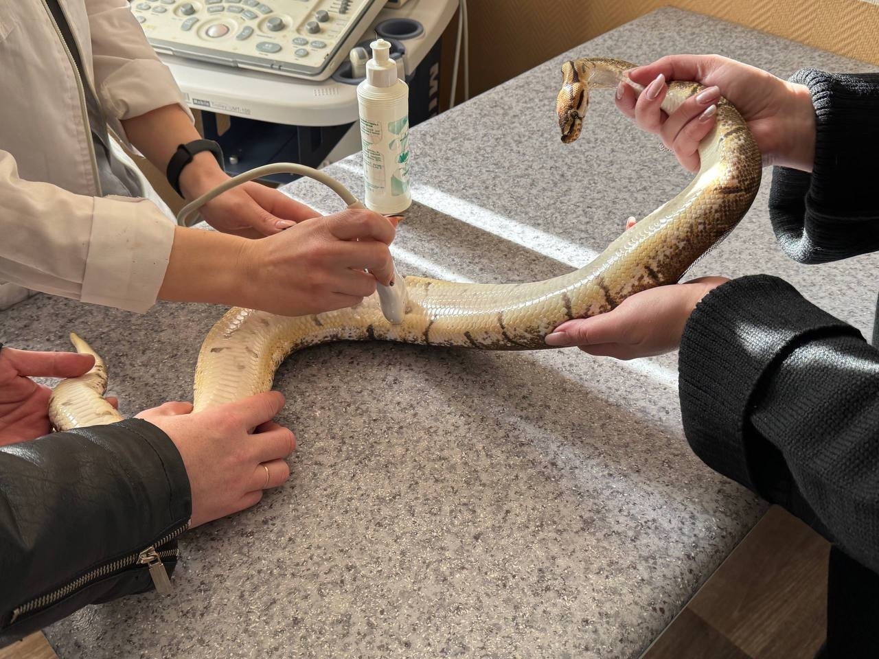 Самку шаровидного питона по кличке Феня на профилактический осмотр привез хозяин питомца. Специалисты провели осмотр рептилии, сделали УЗИ и выяснили, что змея беременна.